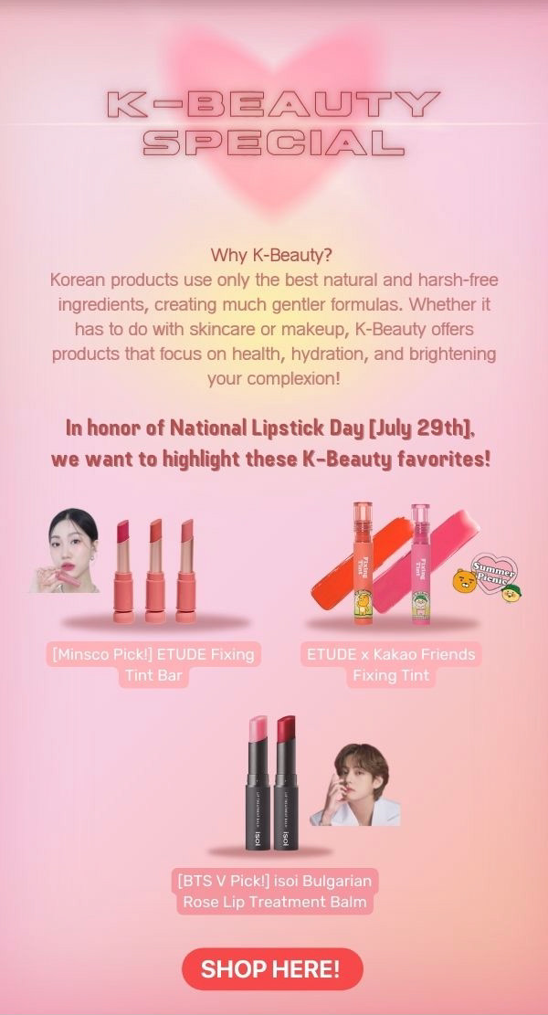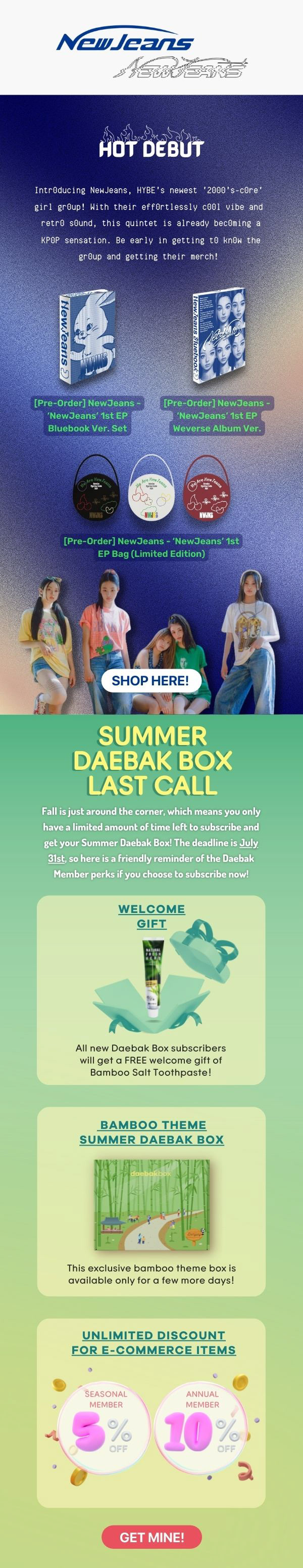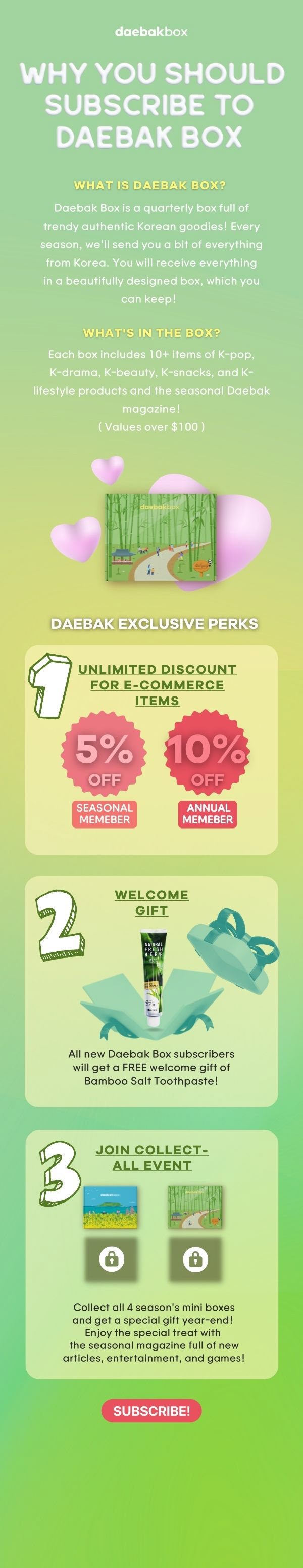 Designed on Canva and the Adobe Suite, these pages were sent to Daebak's loyal subscribers/followers via email blast, advertising Daebak deals, upcoming Korean music, and Korean products.